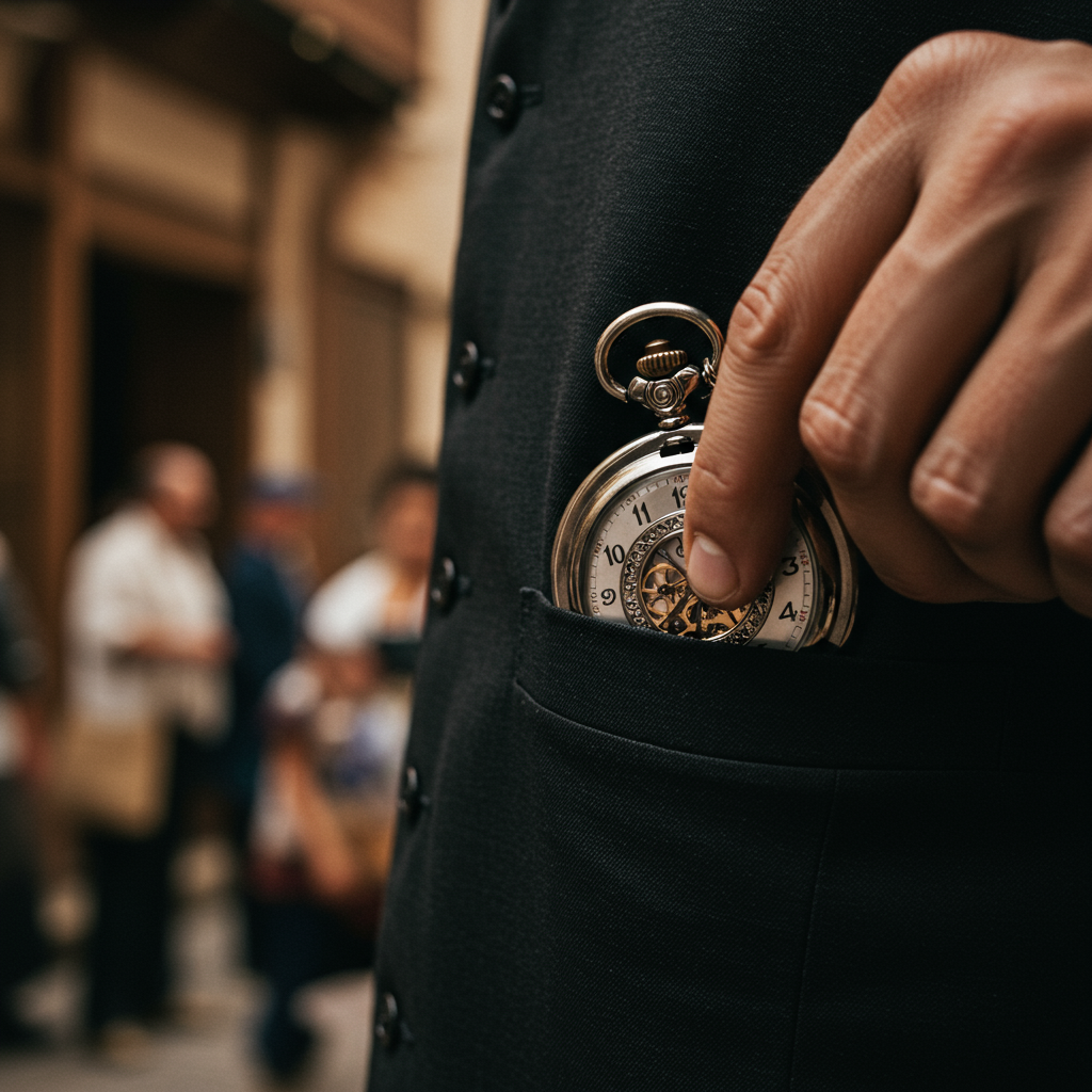 - Montre à gousset : Retrait délibéré de la poche, ouverture du couvercle, consultation discrète du cadran, autonomie garantie.